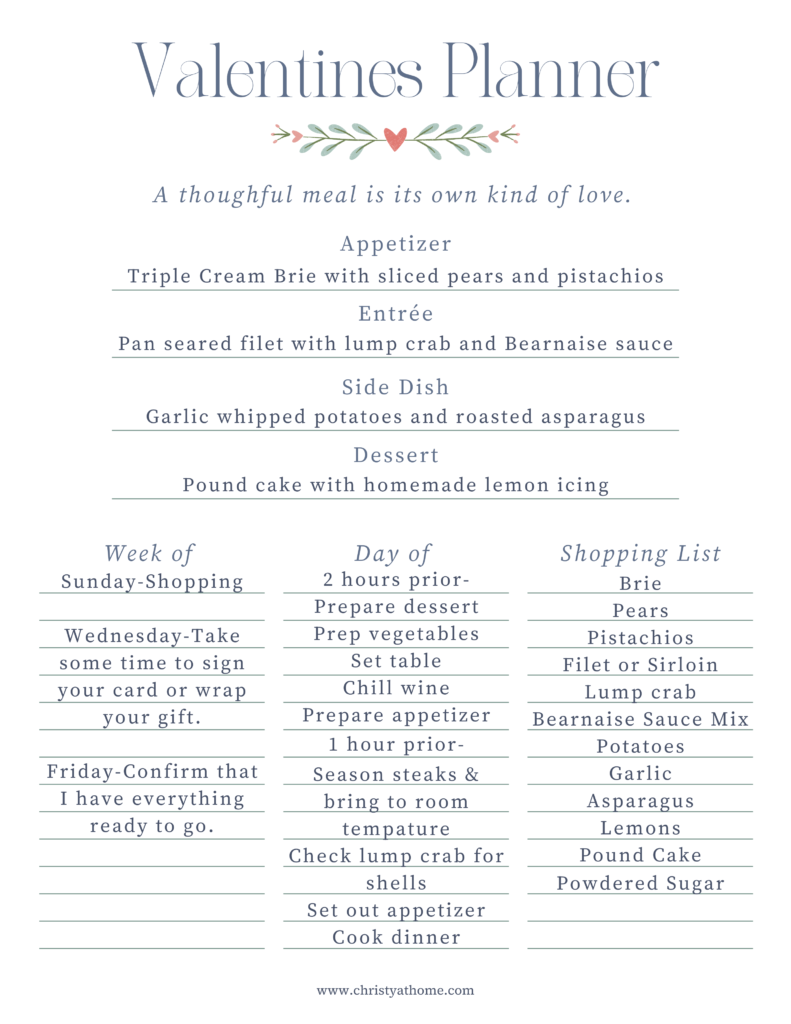 All joking aside, I’m sharing this printable with you in the hope that it helps organize your plans and encourages you to try a romantic dinner at home this year without stressing yourself out.